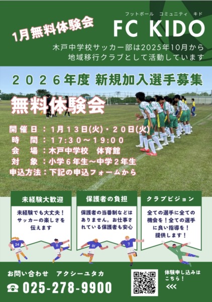 FC KIDOでは小学6年生~中学2年生を対象に無料体験会を開催いたします。